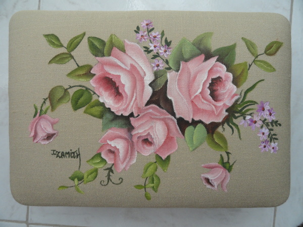 pintadas à mão a Óleo, a Acrílico e Pirogravadas, em Tecidos de Cetim, Chantung e Veludo, nas Dimensões totais de 45X45.